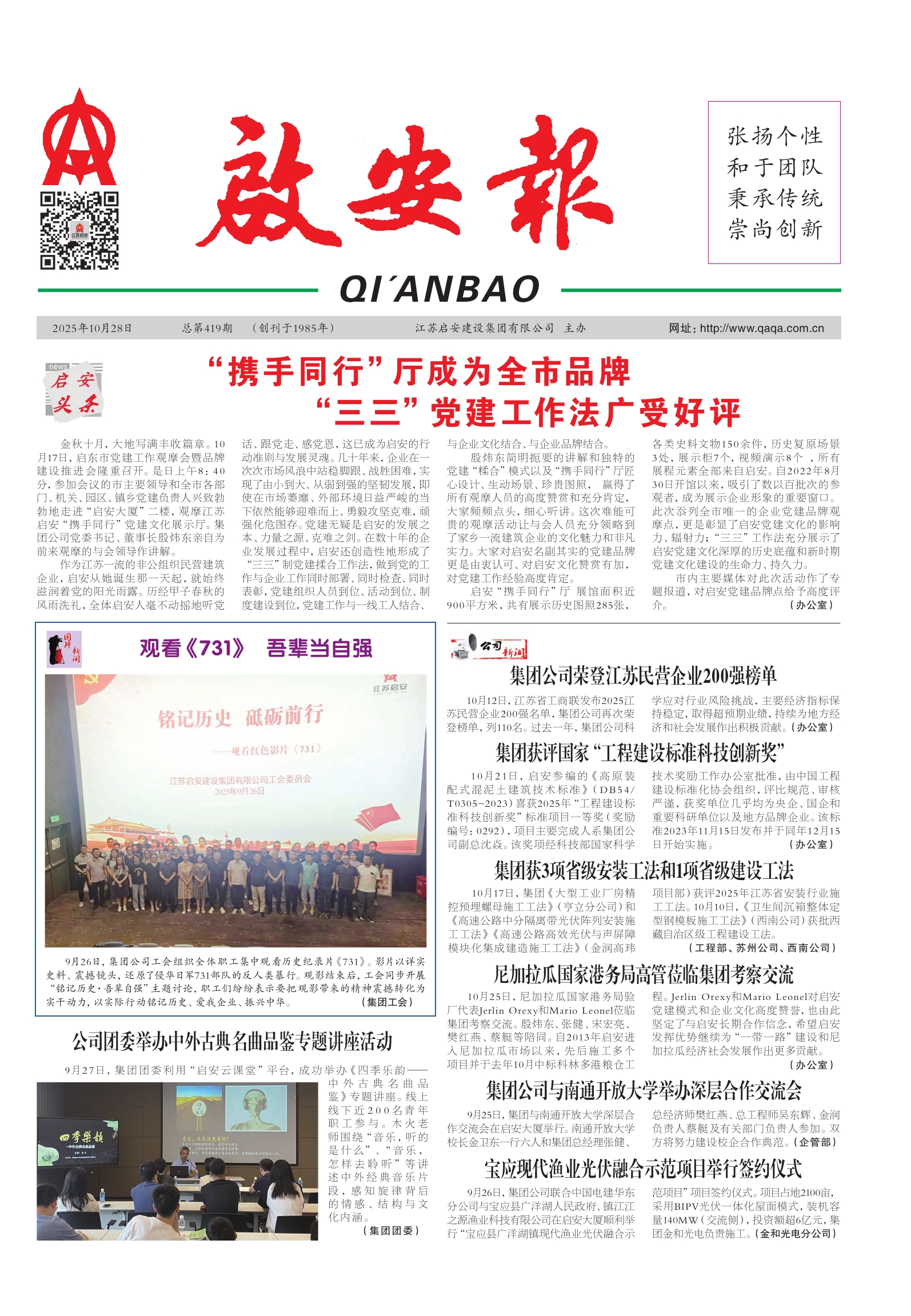作为江苏一流的非公组织民营建筑企业,启安从她诞生那一天起,就始终滋润着党的阳光雨露。历经甲子春秋的风雨洗礼,全体启安人毫不动摇地听党话、跟党走、感党恩,这已成为启安的行动准则与发展灵魂。几十年来,企业在一次次市场风浪中站稳脚跟、战胜困难,实现了由小到大、从弱到强的坚韧发展,即使在市场萎靡、外部环境日益严峻的当下依然能够迎难而上、勇毅攻坚克难,顽强化危图存。党建无疑是启安的发展之本、力量之源、克难之剑。在数十年的企业发展过程中,启安还创造性地形成了 “三三”制党建揉合工作法,做到党的工作与企业工作同时部署、同时检查、同时表彰,党建组织人员到位、活动到位、制度建设到位,党建工作与一线工人结合、与企业文化结合、与企业品牌结合。